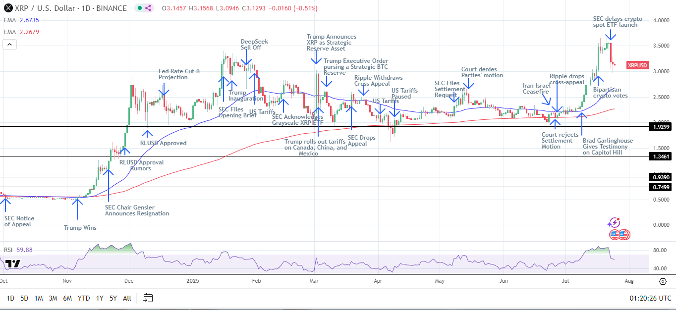 - XRP briefly spiked to $3.2683 intraday on July 24 before retreating to close with a 1.26% loss at $3.1453.