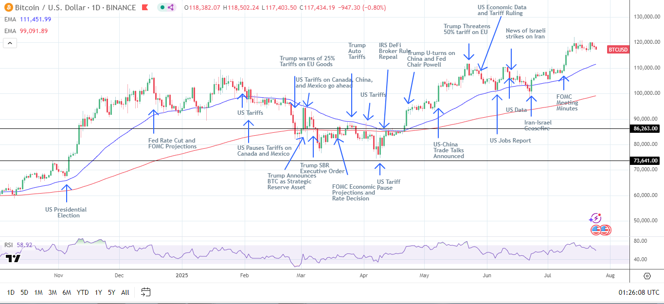 - Bitcoin retreats below $118K; Capitol Hill and July's crypto report now in focus.