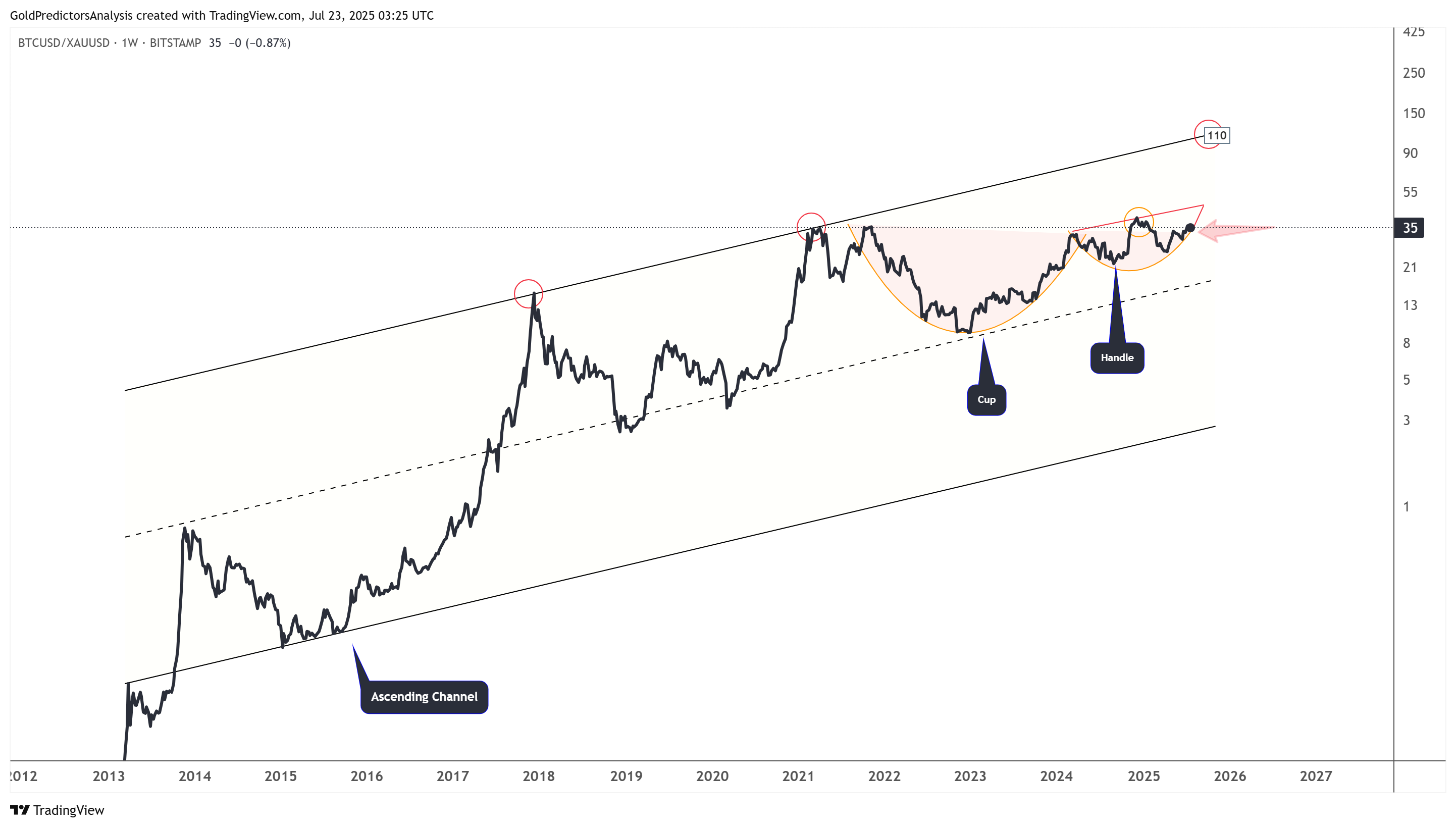 The weekly chart for the Bitcoin-to-Gold ratio shows that the ratio is trading at 35. This indicates strong bullish momentum. The formation of a cup-and-handle pattern drives the momentum. A break above 40 in this ratio would likely trigger a strong surge in Bitcoin prices. This could potentially push Bitcoin above the $140,000 level.
