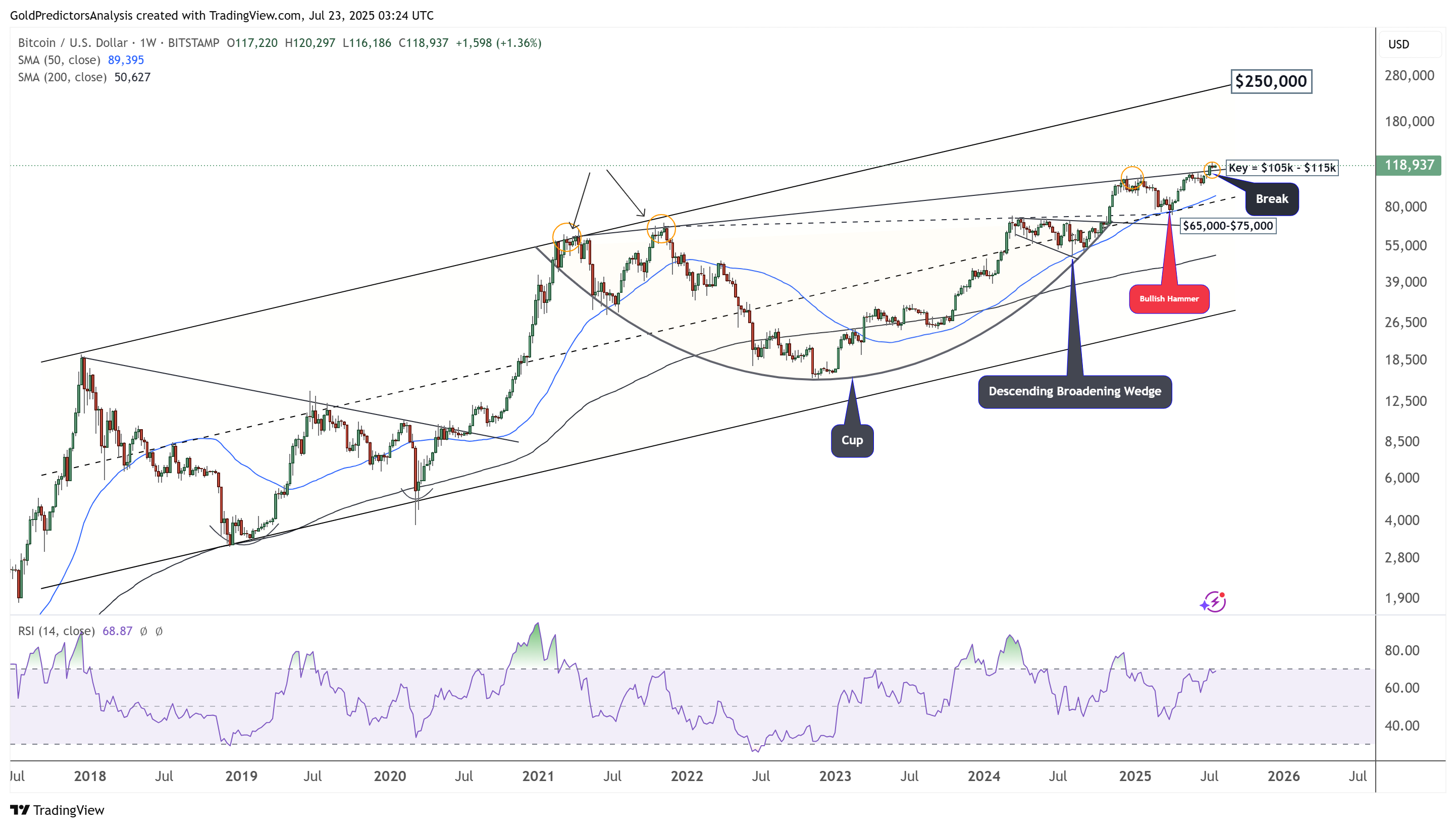 The weekly chart for Bitcoin shows a breakout above the key $115,000 level. As a result, Bitcoin appears ready to surge higher toward the $140,000 area. First, a cup pattern formed on the chart. Then, a breakout occurred from a descending broadening wedge above the $75,000 level. Together, these patterns have initiated a strong bullish trend in Bitcoin prices. Moreover, the RSI is still not in overbought territory, which indicates further upside potential in the current trend.