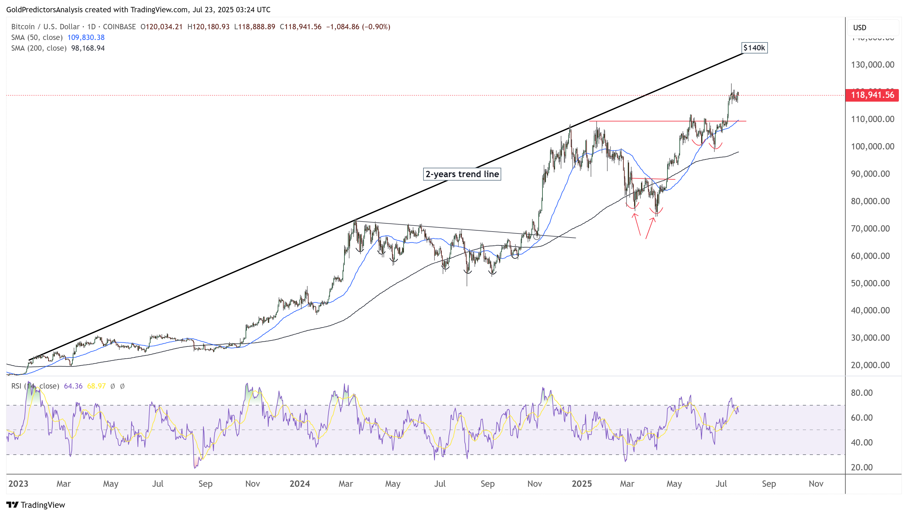 The target for Bitcoin prices can also be seen in the daily chart below, which highlights a two-year trendline extending toward the $140,000 area.