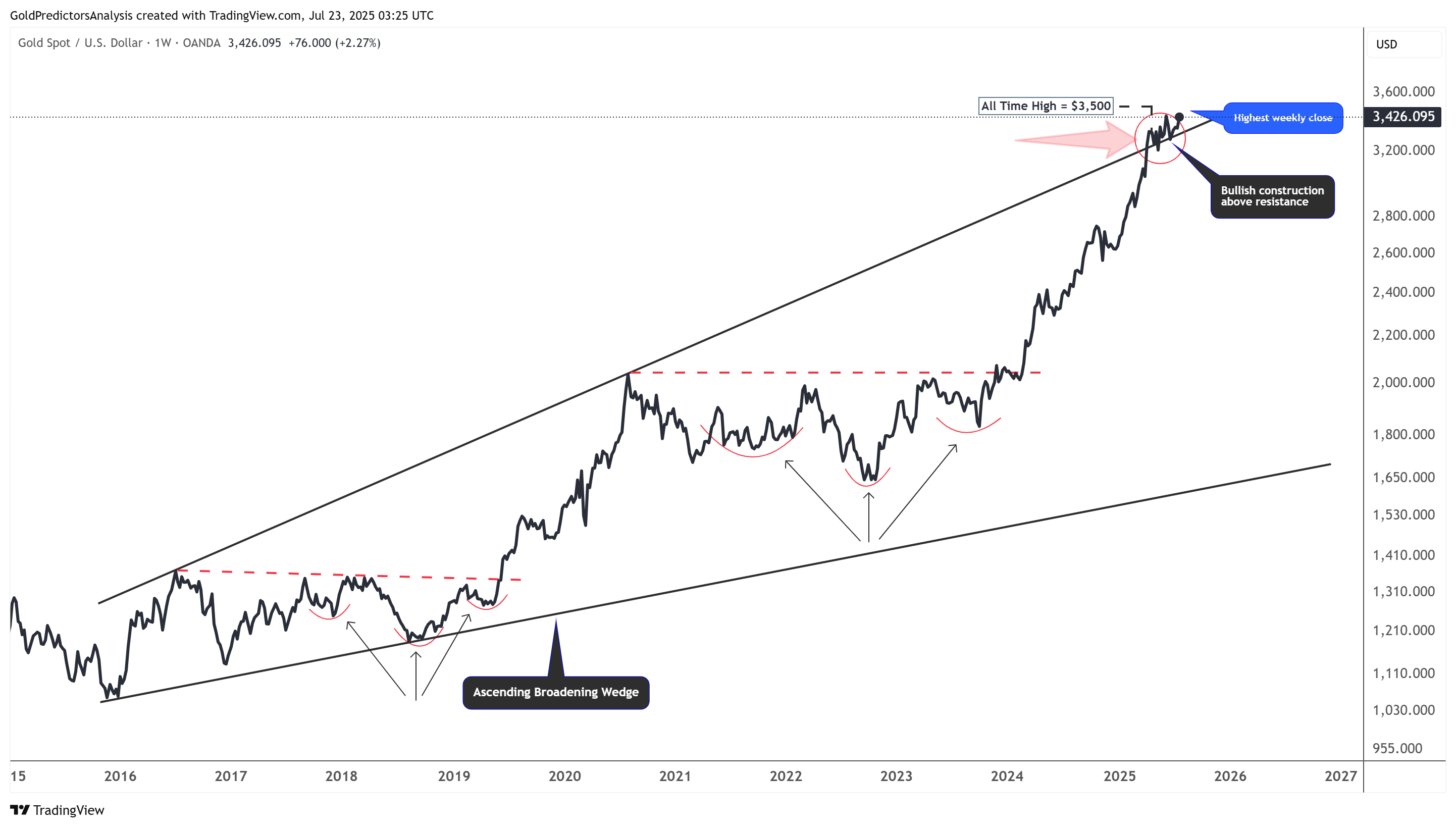 The chart below also shows that gold prices have already broken out of the ascending broadening wedge pattern, indicating a likely move above all-time highs. This is supported by the current consolidation following the breakout, which suggests that a break above the $3,500 area could trigger a more rapid move toward higher levels.
