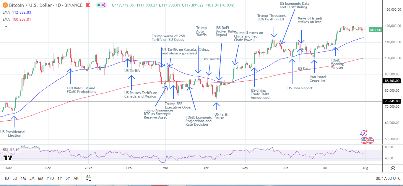 Bitcoin (BTC) joined XRP in the red on July 30, as Fed Chair Powell's press conference impacted demand for risk assets. The Fed kept interest rates unchanged at 4.25% to 4.5%, spotlighting the Fed Chair amid increasing pressure from President Trump to cut rates.