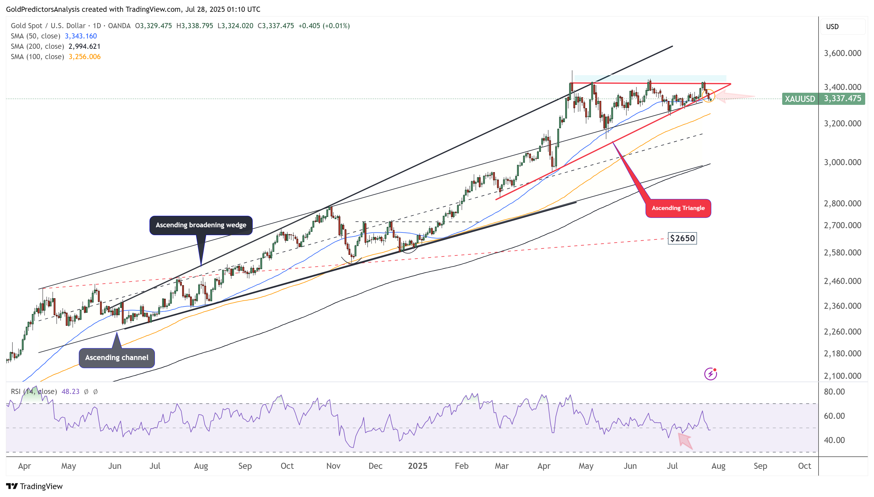The 4-hour chart also shows that spot gold failed to break above the $3,430 resistance area and continued its downward move. Strong support remains near the $3,250-$3,230 level, and a break below this area could trigger further downside. The short-term price action is approaching oversold levels, as indicated by the RSI.