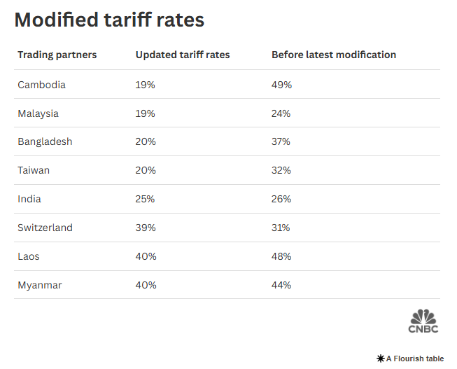 For some Asian nations that have not confirmed a trade pact with the U.S., the latest executive order offered some relief with lower duties. The new tariff rates on imports from Thailand will be lowered to 19% from 36%, and those from Malaysia will be reduced to 19% from the 24% rate set earlier.