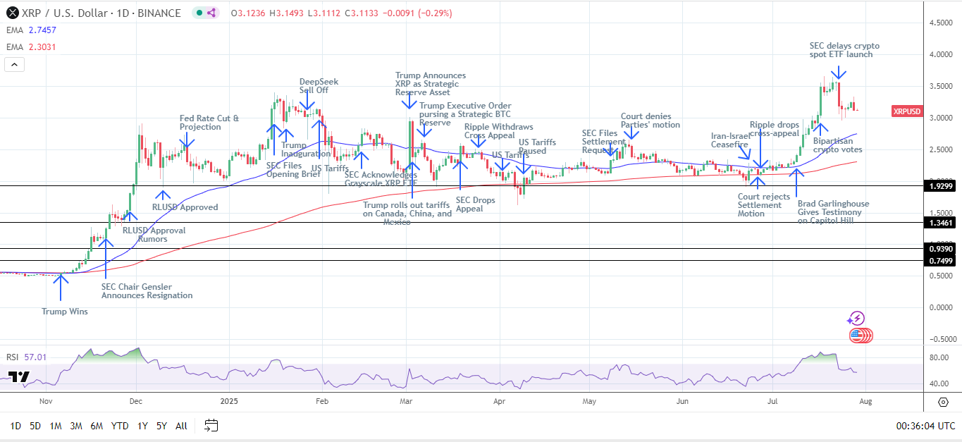 Monday's announcement came ahead of two potentially crucial events. On Wednesday, July 30, the Presidential Working Group on Digital Asset Markets will release its highly anticipated report, potentially recommending cryptos such as XRP as US strategic reserve assets. US government purchases of XRP to build a stockpile would likely tilt the supply-demand balance firmly in XRP's favor, triggering a price breakout.